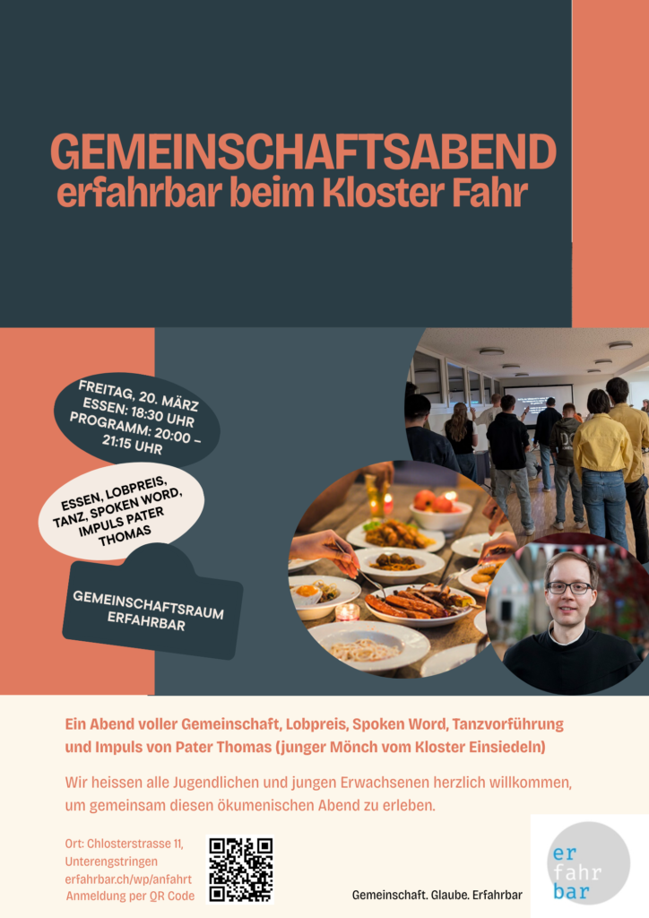 | Programm | 18:30 Uhr: einfaches Abendessen und Gemeinschaft 20:00 Uhr: Lobpreis, Spoken Word und Tanzeinlage von unseren MC-Gästen aus Biel, Kurzimpuls von P. Thomas (junger Mönch aus Einsiedeln) |